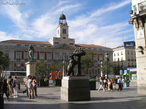 Puerta del Sol. A view of the Puerta del Sol from Calle del Carmen. In the foreground is the statue of the bear and the strawberry tree which was placed here in 1967, and it is Madrid's coat of arms and city symbol. Date: August 19, 2006